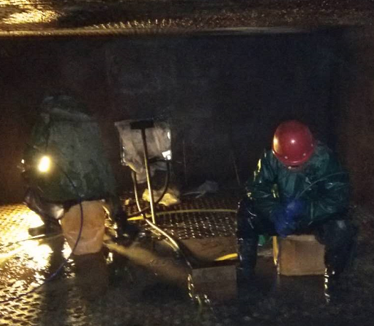 因2#鍋爐上下級空預器堵塞嚴重,無法滿足生產(chǎn)負荷要求,影響鍋爐正常運行,2019年1月14日9點30分,根據(jù)公司停車檢修計劃,對2#鍋爐空預器管進行清洗及疏通,首先在煙道底部制作排水口,引至地溝,保證現(xiàn)場路面無積水及結(jié)冰,待空預器內(nèi)溫度下降,公司領導組織崗位人員輪流進入空預器清理積灰,為空預器管道清洗及疏通做好各項準備工作,15日正式使用清洗機對空預器進行帶壓清洗,所有人員不怕苦、不怕累、放棄休息時間協(xié)助外包人員及時疏通空預器堵塞管道,更換空預器套管,檢修人員雖然穿著厚厚的棉衣,但不一會也被寒冷打透。手凍僵了,他們搓了搓接著干。