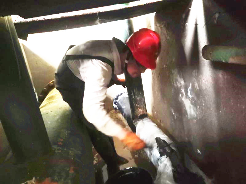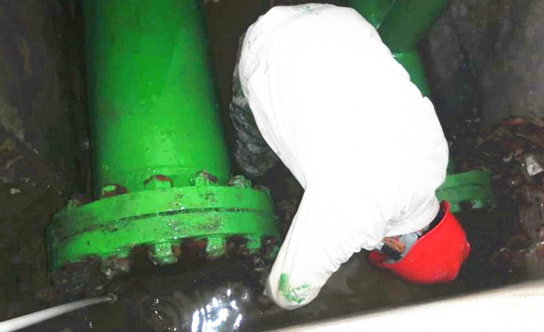 原鹵管線是采鹵崗位重要的組成部分,是停車必檢項之一。但是檢修難度不小,一是過道空間狹小,光線昏暗,一次僅夠兩個人同時作業(yè);二是檢修原鹵管線時,必須“涉水”作業(yè)。檢修期間原鹵管線一閃一閃的焊光將周圍照亮,順著火花向里看去,只見有兩個人在狹小的空間綣著身子低頭忙活著,感覺身子都轉(zhuǎn)不開的樣子。他們像小貓似的蜷縮在兩邊,全身濕透,白色的工服也被銹漬染的亂起八糟,被油漬沁透成一坨一坨的,但他們堅定的眼神、專注的神情卻叫人佩服。我不禁問道:“這么窄的空間人咋進(jìn)去?”他們開玩笑的說:“用縮骨功。”