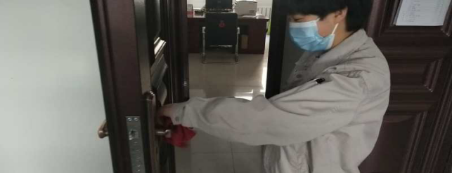 擦拭操作臺(tái)、門把手,工作的有條不紊。