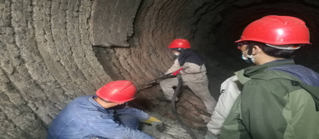 在回轉(zhuǎn)窯,做好更換窯磚前期準備工作——清理深挖4米處窯皮、窯磚。