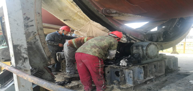 4月27日,此次回轉(zhuǎn)窯檢修已經(jīng)迎來了最后的沖刺階段。工作中最頻繁,最臟的,最累的工作任務(wù)莫過于回轉(zhuǎn)窯大齒輪更換機(jī)油及校正工作。