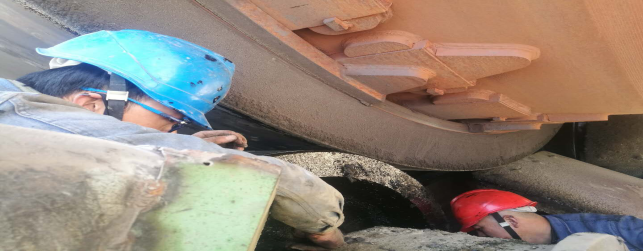 (3)回轉(zhuǎn)窯輪帶擋圈及墊板補(bǔ)焊加固,檢查大齒圈齒面磨損并對(duì)齒面打磨修復(fù)(完成);