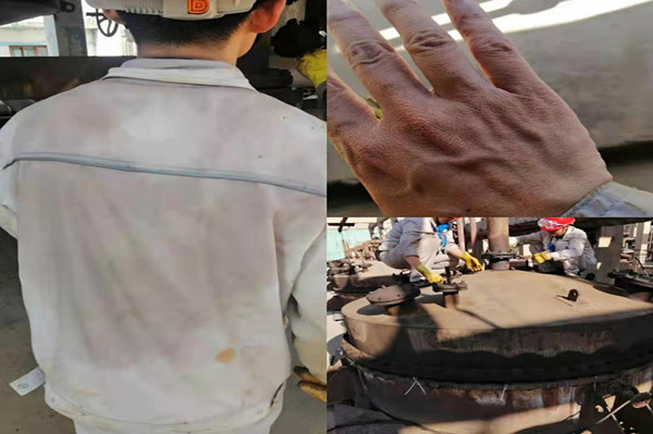 大家都知道轉(zhuǎn)化現(xiàn)場(chǎng)溫度很高,而且近期外界氣溫已高達(dá)三十七八度。轉(zhuǎn)化現(xiàn)場(chǎng)溫度都接近于45度左右,如同一個(gè)大蒸籠,而轉(zhuǎn)化人員卻每天都在這個(gè)大蒸籠里工作;每每投甩完一臺(tái)轉(zhuǎn)化器后,衣服已全部被汗水浸透;到汗珠流到眼睛后,加之與氯化氫氣體接觸,眼睛完全睜不開;在拿掉塑膠手套的那一刻,一雙手被捂的發(fā)白發(fā)皺;如同在水里浸泡了數(shù)小時(shí)一樣,但是就在這樣的工作環(huán)境下,卻沒(méi)有一個(gè)人退縮,都在堅(jiān)守著自己的工作崗位,做出最大的奉獻(xiàn)。