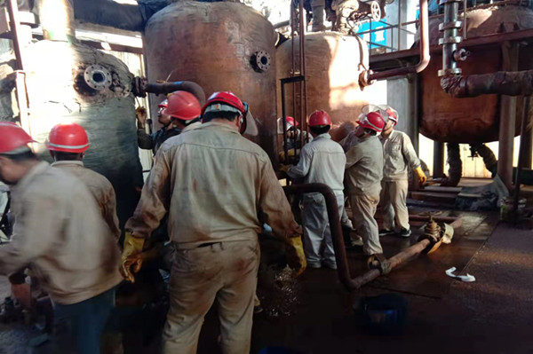 在完成了相關(guān)作業(yè)的準(zhǔn)備工作,參與檢修人員穿戴好各類防護(hù)用品,辦理各類票證后,大家就進(jìn)入到檢修現(xiàn)場(chǎng)。更換再沸器設(shè)備前,必須先排盡設(shè)備內(nèi)的氯化鈣,由于連接管線不能徹底排盡設(shè)備管線內(nèi)物料,只能通過(guò)人工接力的方式,將管線剩余的氯化鈣一桶一桶的接出,并迅速的倒入回收貯罐內(nèi)。整個(gè)過(guò)程必須密切協(xié)作,否則就會(huì)造成氯化鈣的大量外溢,在環(huán)保壓力如此大的今天,是絕對(duì)不容許的。經(jīng)過(guò)近一個(gè)小時(shí)的努力,設(shè)備管線內(nèi)的氯化鈣終于排放干凈。此時(shí)每個(gè)人的臉上都浸滿了汗水,這也是檢修人員最美麗的時(shí)刻。