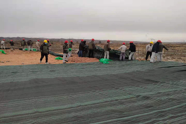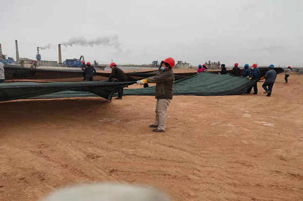 由于公司電石泥堆場(chǎng)地更換為新原料堆場(chǎng)造成的部分土地裸露,造成揚(yáng)塵污染,治風(fēng)沙、阻揚(yáng)塵這項(xiàng)工作迫在眉睫;初冬的天氣冷風(fēng)呼啦啦掃動(dòng)著滿地的枯葉紙屑,濃黑的云像一團(tuán)團(tuán)破絮,倒懸在我們的上空,北風(fēng)呼呼那個(gè)吹,任憑它的怎么肆虐卻擊退不了職工們工作的熱情,瞧他們單膝蓋在潮濕的泥土上細(xì)心的用鐵絲鏈接著每個(gè)接口。男職工展現(xiàn)大力水手的魅力,兩人一卷,一人一卷有序的擺放在裸露的土地中央,女同事也不甘示弱拆開整卷防塵網(wǎng)整齊的鋪在砂石頂部,大家喊著整齊的口號(hào),經(jīng)過一早上不懈努力,就將整個(gè)原料場(chǎng)地覆蓋完畢。既抑制滿天風(fēng)沙的場(chǎng)景,也保存了大量的原料被風(fēng)帶走,造成原料損耗。
