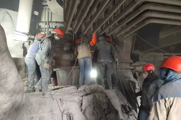 剛踏上平臺,首先映入筆者眼簾的,是一群穿著藍色牛仔工裝的工友們正在有序的拆卸二層爐面保溫材料準備更換燒損下料柱。只見他們個個干勁十足、衣服早已被汗水浸濕、黑乎乎的臉看不清誰是誰?他們顧不得爐面余溫的熾熱、爐面積灰的刺鼻積極投入到檢修中,一時間吶喊聲、叉車鳴笛聲,起重吊車的口哨聲,聲聲作響,猶如一首交響樂響徹整個檢修現(xiàn)場!在大家的齊心協(xié)力下,燒損下料柱順利被拆下,并按時裝好!
