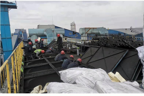 “兵分兩路,烈日前行”。5月22日早晨8:30,30多人開始在除塵系統(tǒng)頂部開始舊布袋和袋籠的拆除工作!耙粋布袋長4.2米,全部堆到這兒,對平臺上的作業(yè)人員很不安全,我們還是把布袋疊好,放在大袋子中,這樣現(xiàn)場就不亂了!睅酌毠ぜ皶r規(guī)整舊布袋。