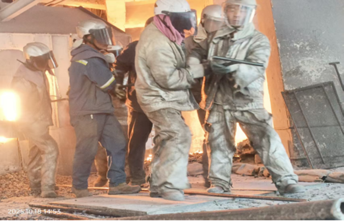 出爐工,是這里的主角。他們身著被汗水反復(fù)浸透又烤干、結(jié)出白色鹽漬的阻燃服,頭戴沉重的防護(hù)頭盔,像無畏的戰(zhàn)士,堅(jiān)守在陣地的最前沿。他們的工作,是時(shí)刻關(guān)注爐況,用長長的鋼釬疏通投料口,防止“棚料”。每一釬下去,都需要全身的力氣,與爐內(nèi)黏稠的料漿抗?fàn)帯:顾畯念~頭滾落,迷住雙眼,卻來不及擦拭,因?yàn)闋t火不等人。