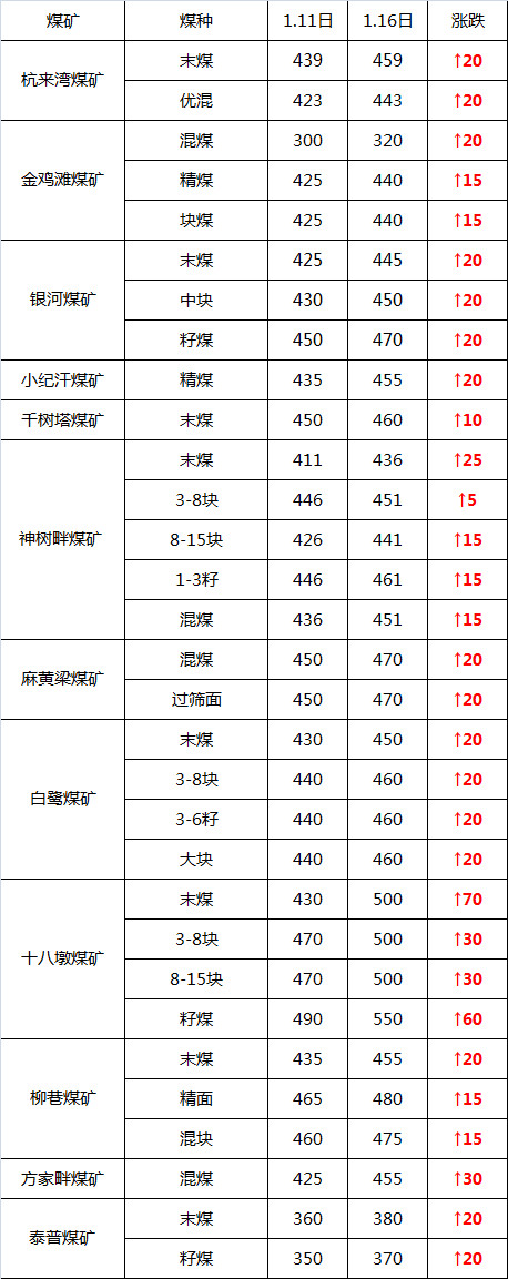 據(jù)榆林煤炭交易中心數(shù)據(jù)統(tǒng)計(jì),與1月11日相比,目前榆林的在產(chǎn)煤礦價(jià)格漲幅最高達(dá)到了70元/噸。