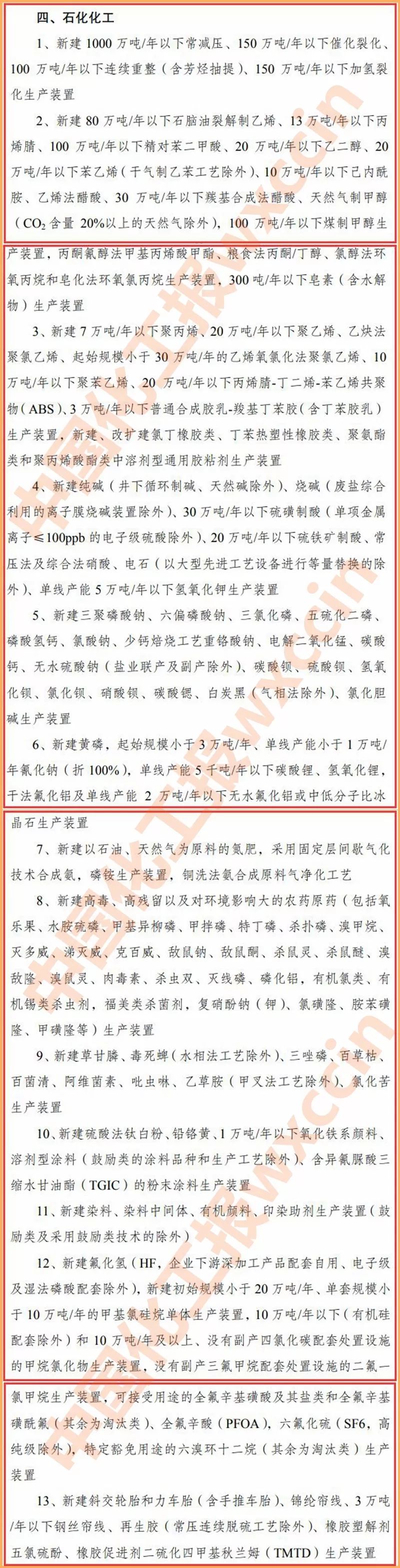石化化工行業(yè)限制類有13大類,包括:新建 1000 萬噸/年以下常減壓裝置;新建80萬噸/年以下石腦油裂解制乙烯、13萬噸/年以下丙烯腈、100萬噸/年以下精對苯二甲酸、20 萬噸/年以下乙二醇、20 萬噸/年以下苯乙烯(干氣制乙苯工藝除外);新建純堿(井下循環(huán)制堿、天然堿除外)、燒堿、30 萬噸/年以下硫磺制酸、20 萬噸/年以下硫鐵礦制酸、常壓法生產(chǎn)裝置;新建以石油、天然氣為原料的氮肥,采用固定層間歇氣化技術(shù)合成氨,磷銨生產(chǎn)裝置,銅洗法氨合成原料氣凈化工藝;新建高毒、高殘留以及對環(huán)境影響大的農(nóng)藥原藥生產(chǎn)裝置;新建草甘膦、毒死蜱(水相法工藝除外)、三唑磷、百草枯、百菌清、阿維菌素、吡蟲啉、乙草胺(甲叉法工藝除外)、氯化苦生產(chǎn)裝置;新建染料、染料中間體、有機(jī)顏料、印染助劑生產(chǎn)裝置(鼓勵類及采用鼓勵類技術(shù)的除外)等。
