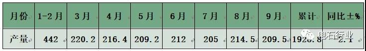 據(jù)國家統(tǒng)計局數(shù)據(jù)顯示:9月國內電石產量為209.5萬噸,同比下降7.1%;1-9月累計產量達到1928.8萬噸,同比下降2.1%;據(jù)統(tǒng)計,產能有效發(fā)揮率63%(除去長期停產、半停產的1000萬噸,產能有效發(fā)揮為83%)。據(jù)我會統(tǒng)計:產能前十位的集團公司1-9月份完成電石產量為982萬噸,同比增長1.9%;20萬噸以上企業(yè)72家1-9月份完成產量約為1871萬噸,同比增長0.92%。