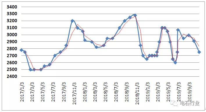 2019年電石市場波動不同于2018年,價格出現(xiàn)了連續(xù)快速的波動,漲跌幾乎無任何喘息時間,主要受到供需持續(xù)波動的影響。前半年經歷大幅漲跌,上漲時連續(xù)大漲,漲幅超過600元/噸,下跌時快速下移,降幅跌破成本線后再度下行400元/噸,回吐了全部漲幅;三季度電石價格呈現(xiàn)“N”字型走勢,先漲后跌再漲,變化幅度略小于上半年:7月價格前漲后穩(wěn)月底局部小幅下調,多數(shù)時間慣性上漲200-300元/噸,隨后月底局部價格下調50元/噸左右;8月份價格下行200-300元/噸,回吐前期漲幅;9月份價格再度反彈,至月底已反彈了150-250元/噸不等;10月電石價格再次極速下滑300元/噸,1-10月電石價格呈現(xiàn)“M”字型,回落到當前主流價格的2550-2650元/噸。