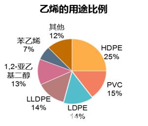 聚乙烯(簡稱“PE”)以及聚氯乙烯(簡稱“PVC”),都與乙烯有相當密切的聯(lián)系。乙烯源于液化天然氣、液化石油氣、輕柴油、重油或原油等經(jīng)裂解產(chǎn)生的裂解氣中分出,亦可以從焦爐煤氣中產(chǎn)生,還可以從乙醇脫水中獲得。在全球聚乙烯制作方法中,其中44%為原油產(chǎn)出石腦油制乙烯,43%為天然氣產(chǎn)出乙烷氣制乙烯,13%為煤炭/天然氣產(chǎn)出甲醇制乙烯。在乙烯的所有用途中,PE和PVC對乙烯的使用量最大,分別占比53%和15%。