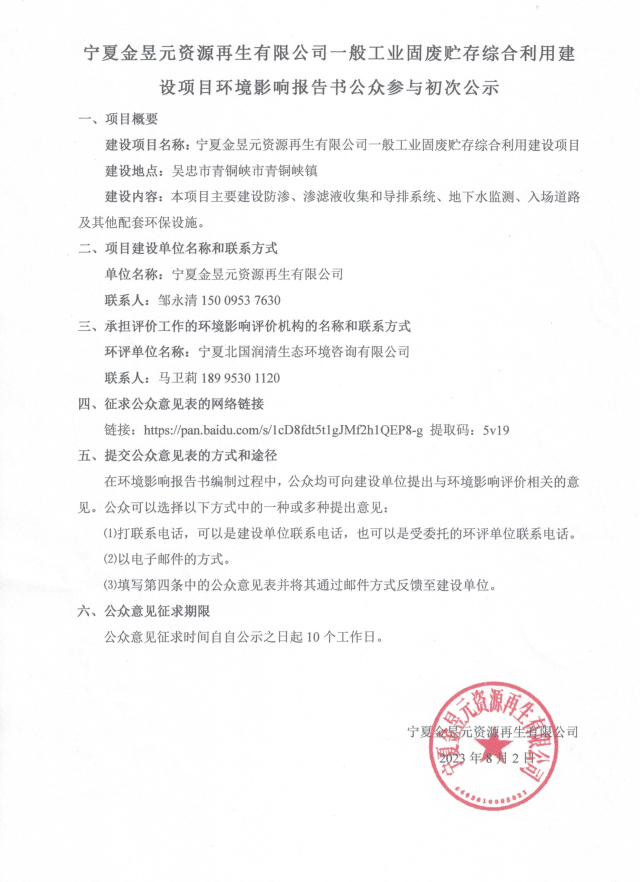 寧夏金昱元資源再生有限公司一般工業(yè)固廢貯存綜合利用建設項目環(huán)境影響報告書公眾參與初次公示