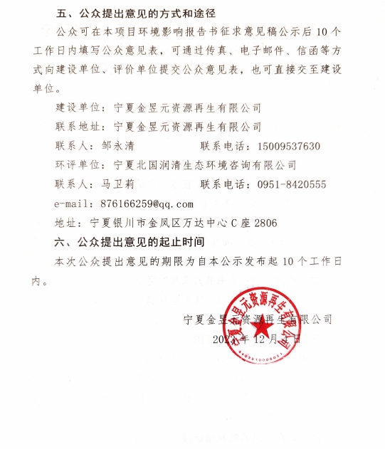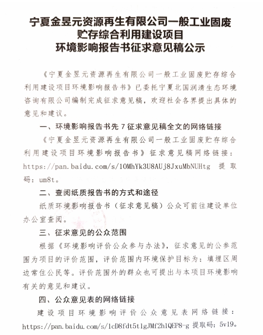 寧夏金昱元資源再生有限公司一般工業(yè)固廢貯存綜合利用建設項目征求意見稿公示